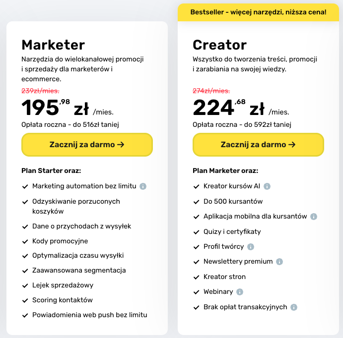 Pakiet Marketer w GetResponse oferuje zaawansowane narzędzia, które pomogą Ci skutecznie konwertować potencjalnych klientów. Co więcej! W ramach tego pakietu dostaniesz dostęp do funkcji takich jak cykle oparte na zdarzeniach, webinary, zaawansowana segmentacja, scoring dla kontaktów, a także lejki sprzedażowe.