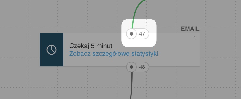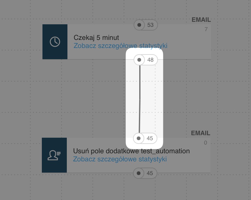 Natomiast jeśli usuniesz blok i zastąpisz go innym, liczby zostaną wyzerowane, a wszystkie kontakty znajdujące się w poprzednim bloku zostaną usunięte z cyklu. Przykład: jeśli 30 osób opuściło poprzedni blok (warunek) i trafiło do bloku akcji, który następnie zastąpisz nowym blokiem, to nowy blok będzie miał 0 wejść i 0 wyjść. Te 30 kontaktów, które weszły do poprzedniego bloku, nie zostanie pokazanych w statystykach nowego elementu. Może się więc wydawać, że te 30 kontaktów „zniknęło”, ale niekoniecznie tak jest. Jeśli któryś kontakt zwrócił wiadomość (bounce) lub wypisał się po otrzymaniu wiadomości ustawionej w cyklu, został automatycznie usunięty z cyklu automation — stąd różnica między liczbą wejść a wyjść w cyklu.