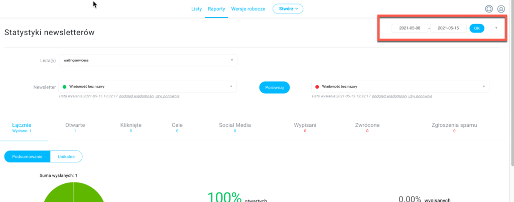 - W zakładce raportów Email marketingu, Autoresponderów lub Wiadomości automation, wybierz powiązane listy.