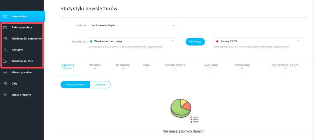 - Wybierz Email marketing, Autorespondery lub Wiadomości automation w zależności od typu wiadomości który chcesz sprawdzić.