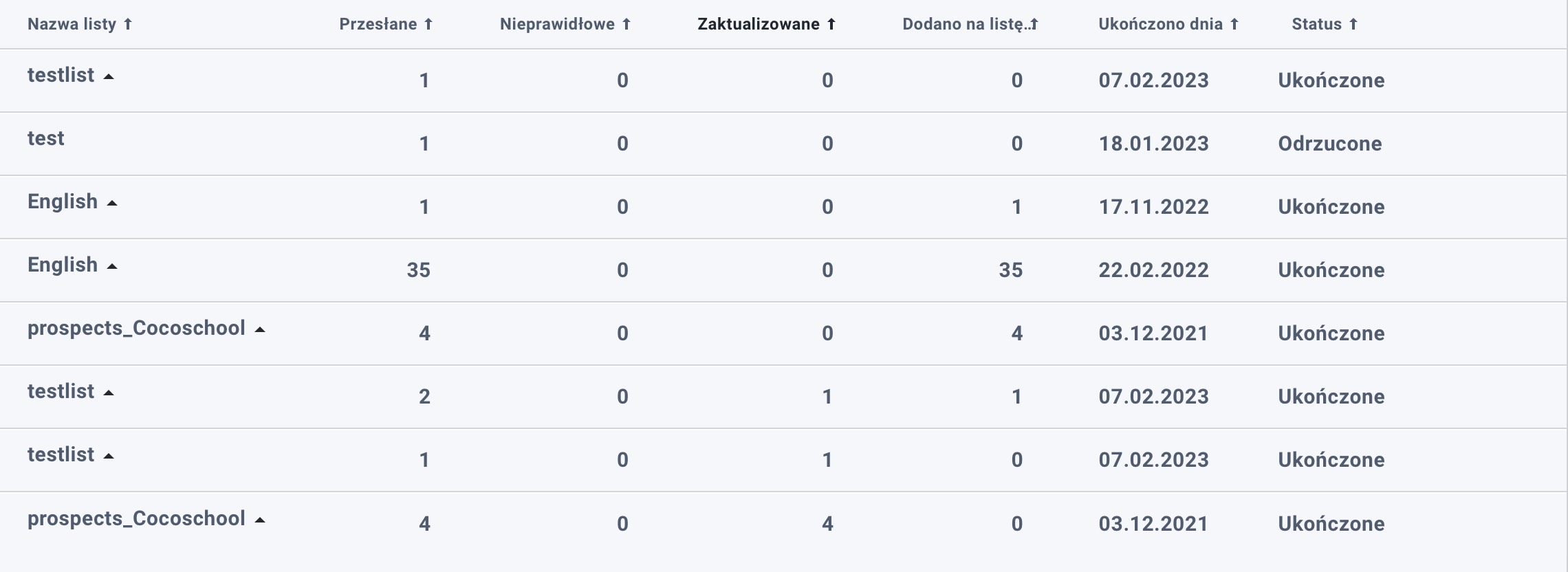 - Sortowanie importów. Klikaj małe trójkątne strzałki obok nagłówków kolumn, aby sortować importy według nazwy listy, rezultatu, daty lub statusu.