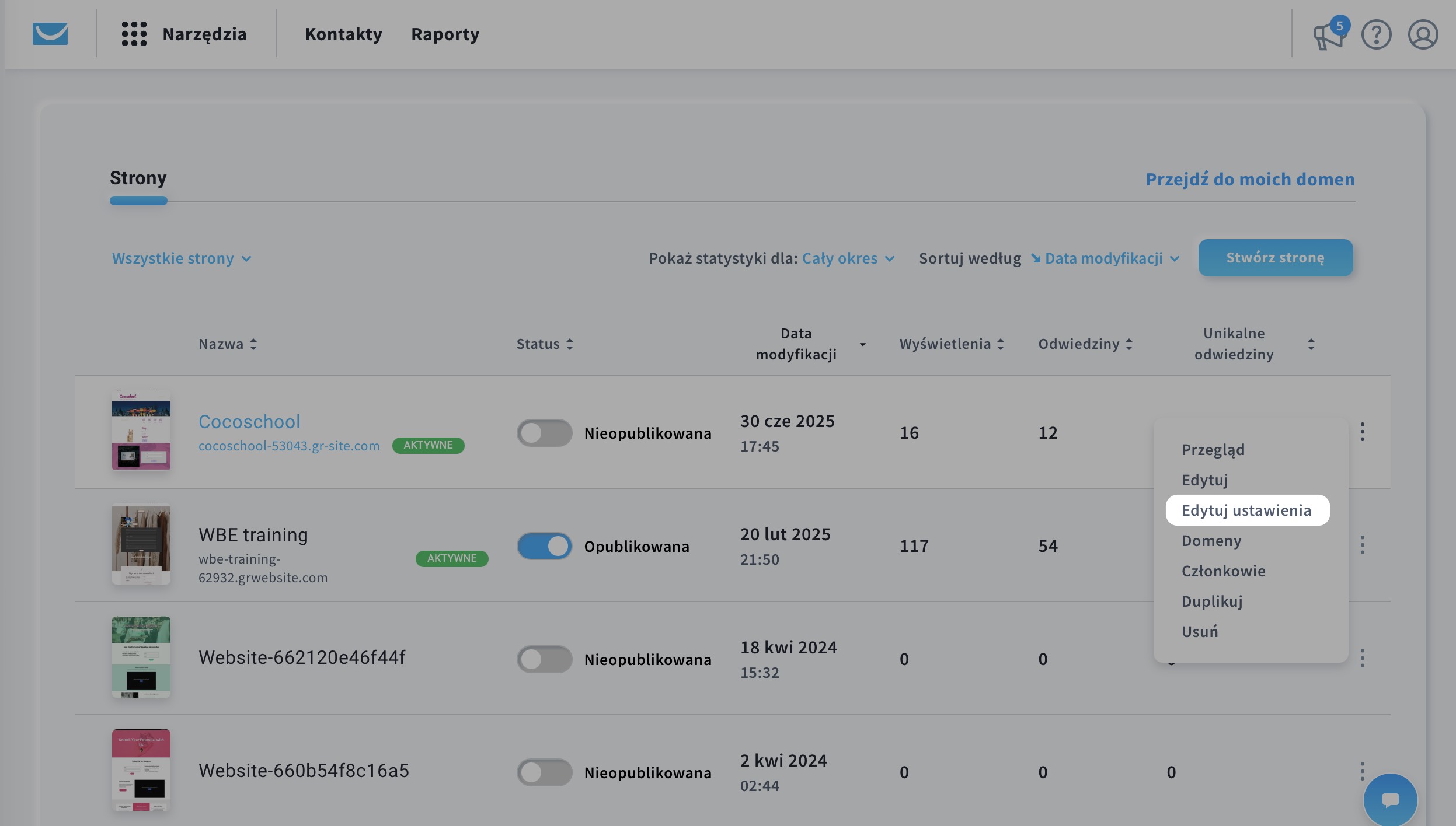- Przejdź do Narzędzia > Kreator stron.