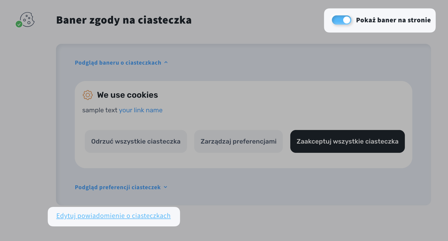 - Przewiń w dół do sekcji Baner zgody na ciasteczka i włącz opcję Pokaż baner na stronie.
