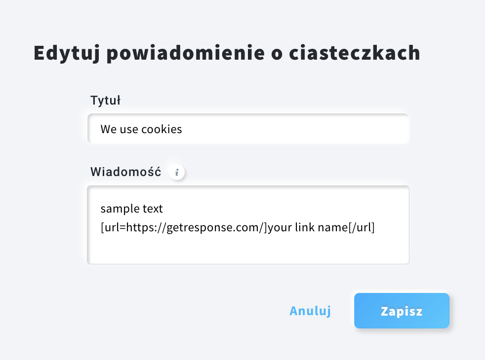 - Kliknij Edytuj powiadomienie o ciasteczkach, aby zmienić tytuł, wiadomość, tekst przycisku odrzucenia i potwierdzenia. Aby dołączyć link do powiadomienia o plikach cookie, użyj następującego formatu: