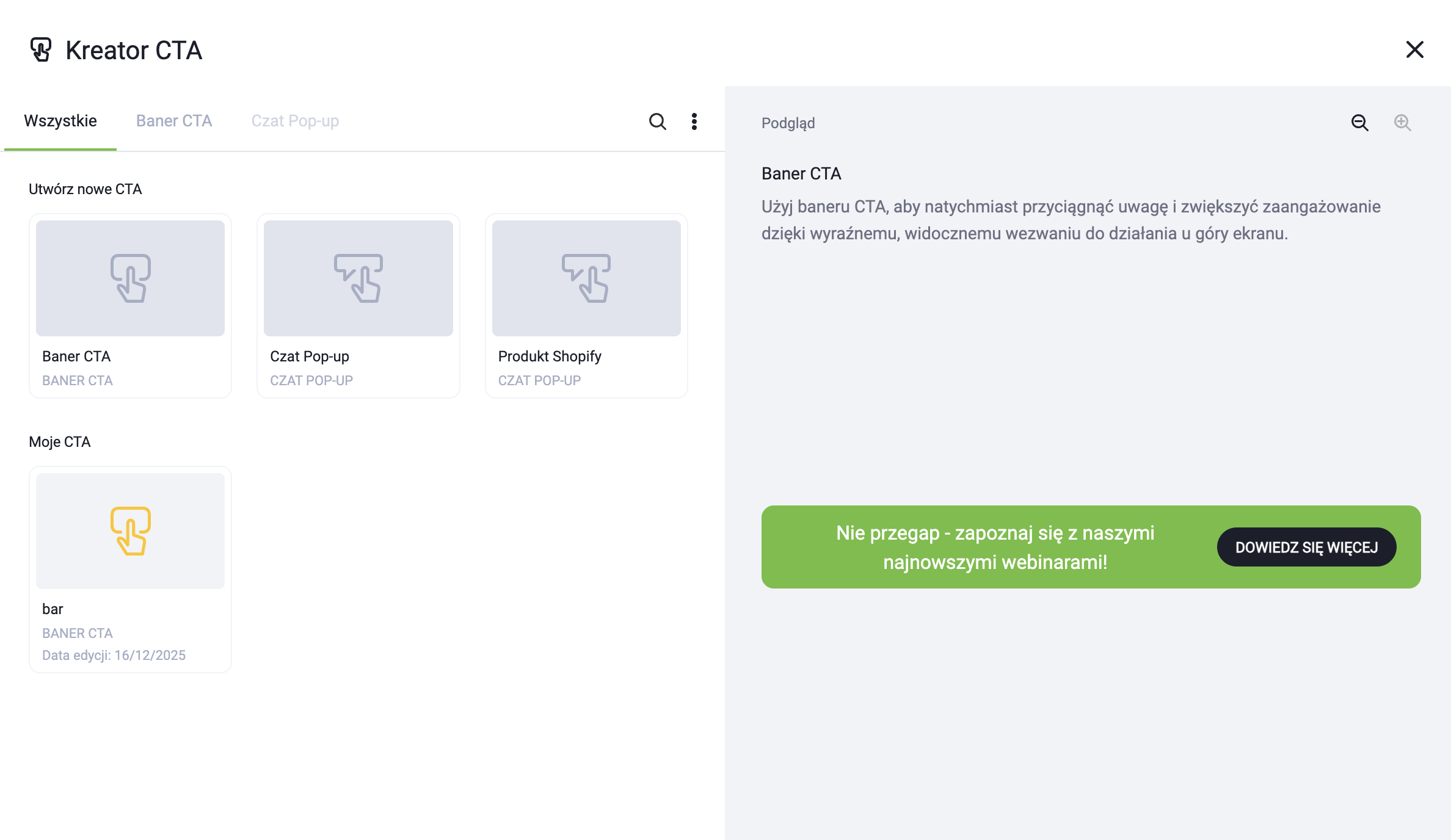 Spowoduje to otwarcie Kreatora CTA, w którym możesz wybrać istniejące CTA (w sekcji Moje CTA) lub utworzyć nowe.