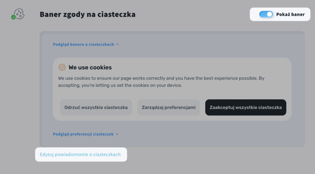 Kliknij Edytuj powiadomienie o ciasteczkach, aby zmienić jego tytuł, komunikat, tekst linku do odrzucenia i tekst przycisku potwierdzenia.