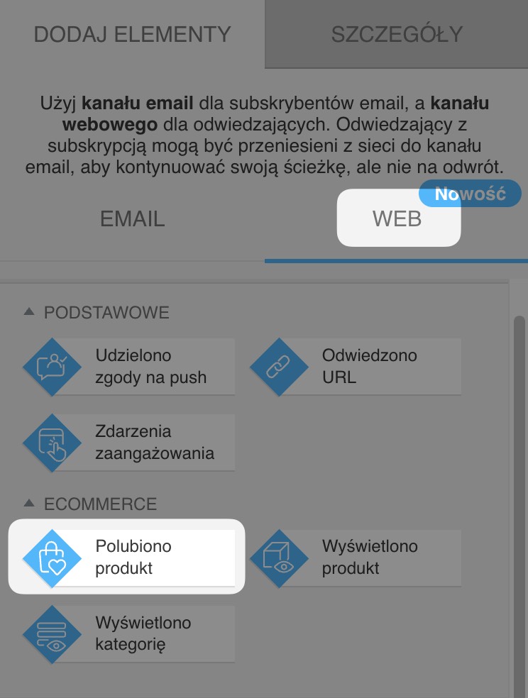 - Przeciągnij element Polubiono produkt z sekcji Warunki w kanale WEB w edytorze automatyzacji.