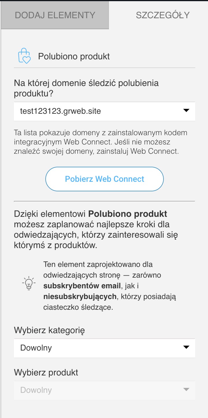 Aby skorzystać z tego warunku, musisz mieć poprawnie zainstalowany Web Connect na swojej stronie internetowej. Skrypt ten jest niezbędny do integracji różnych usług GetResponse i umożliwia przesyłanie danych o zdarzeniach za pośrednictwem Web Connect, zarówno poprzez nasze wtyczki, jak i niestandardowe implementacje.