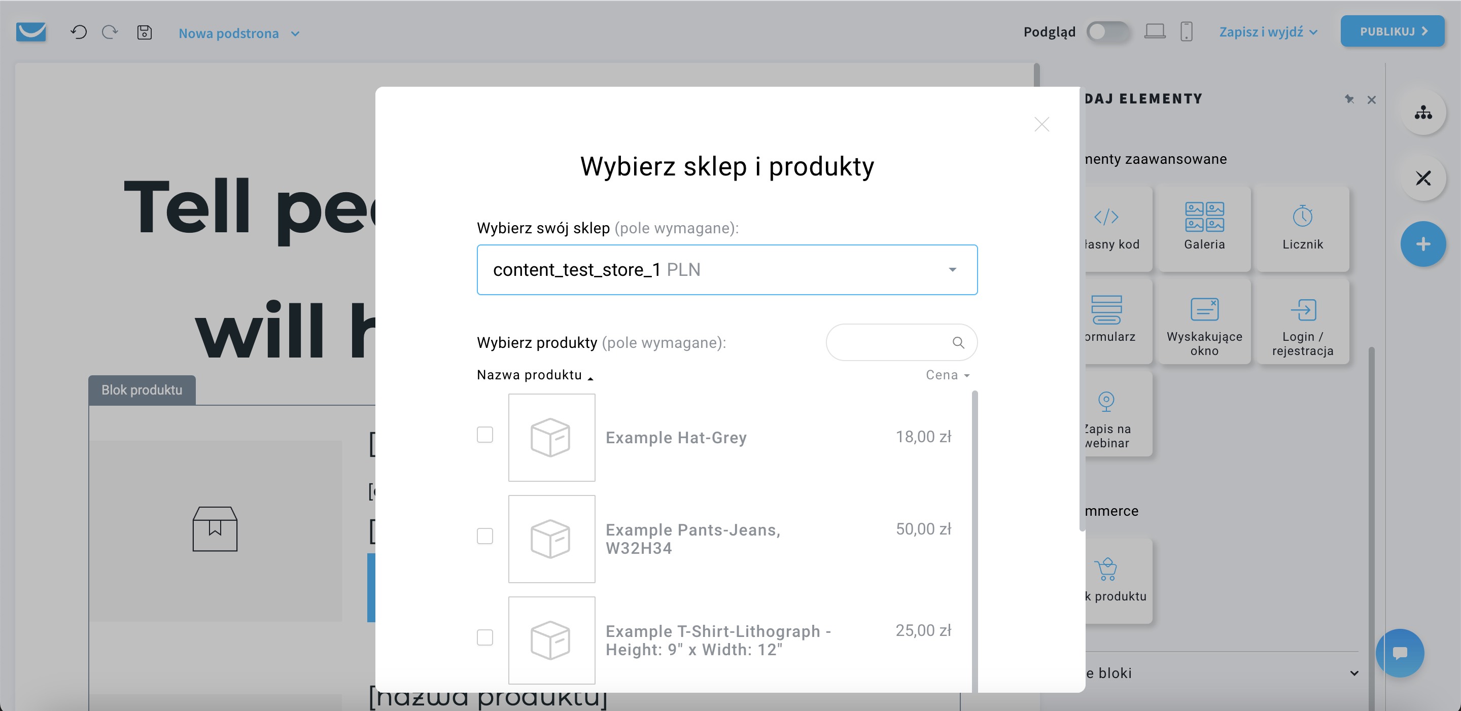 - W wyskakującym okienku wybierz produkty ze swojego sklepu, które chcesz pokazać na swojej stronie.