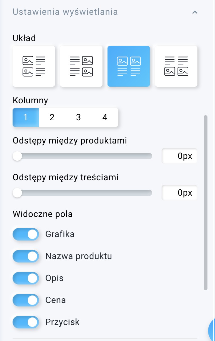 - Rozwiń Ustawienia wyświetlania, aby edytować układ, odstępy oraz widoczne pola dla wszystkich pokazanych produktów.