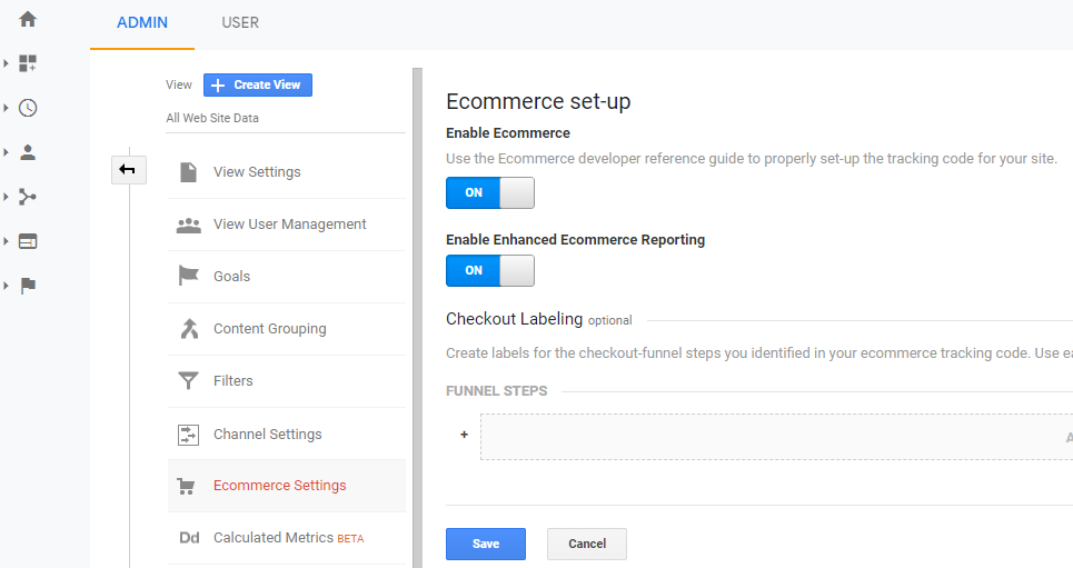 Możesz to skonfigurować w zakładce Admin. Tam powinieneś wybrać pozycję Ecommerce Settings w kolumnie View i włączyć Enable Ecommerce, a także Enhanced Ecommerce Reporting.