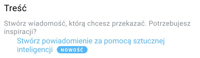 - W sekcji Treść wprowadź tytuł powiadomienia (maksymalnie 250 znaków). Użyj chwytliwego hasła lub nazwy swojej marki.