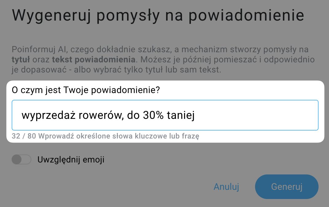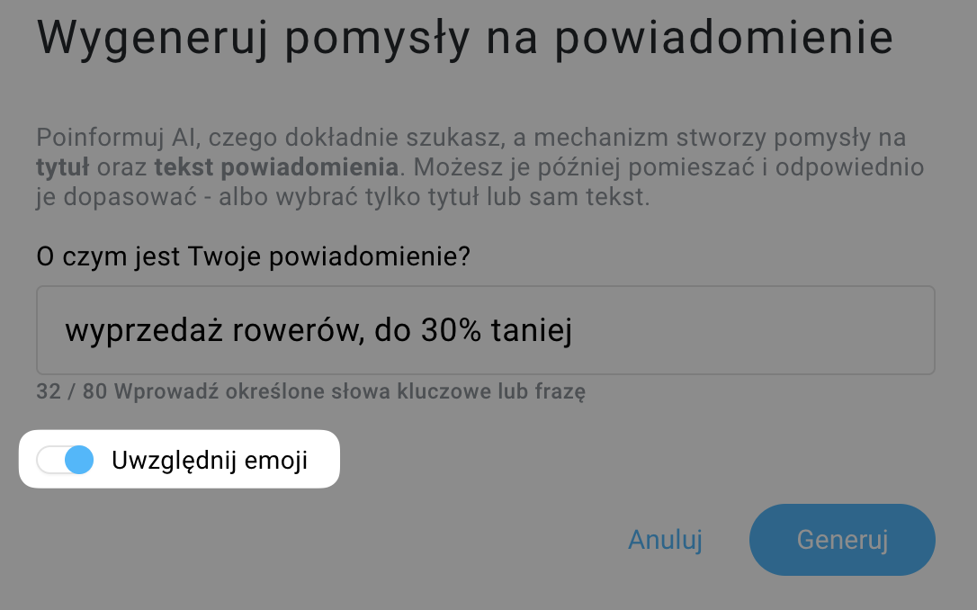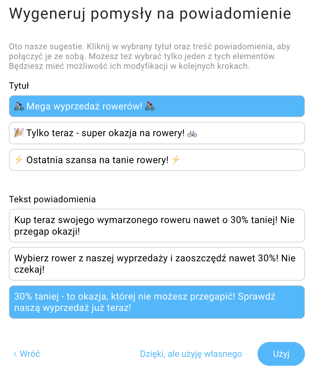 - Wybierz jeden z trzech tytułów i jeden z trzech tekstów powiadomień sugerowanych przez sztuczną inteligencję.