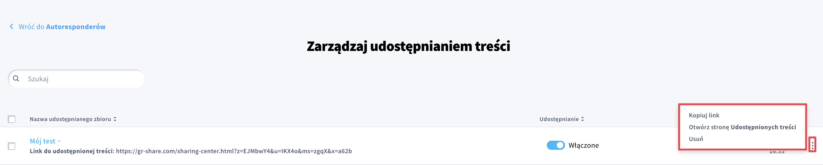 - Aby udostępnić pojedynczy autoresponder, kliknij menu akcji i wybierz Udostępnij.