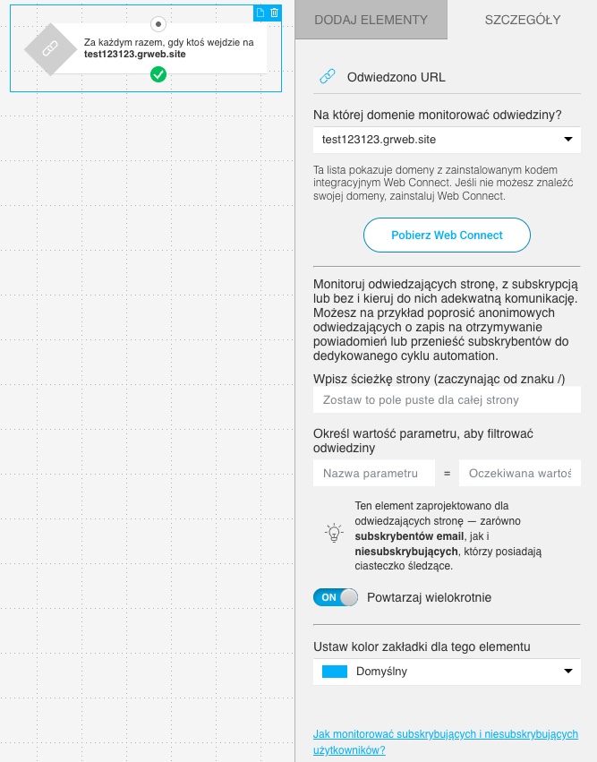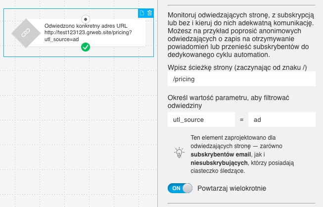 W takim przypadku nazwą parametru będzieutm_source, a oczekiwaną wartością –ad - Możesz także włączyć opcję Powtarzaj wielokrotnie, dzięki czemu warunek będzie uruchamiany za każdym razem, gdy spełnione zostaną zdefiniowane kryteria.
