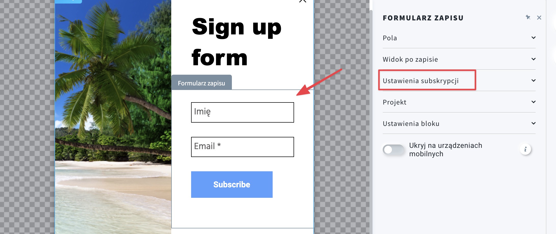 - Kliknij element formularza zapisu i rozwiń zakładkę Ustawienia subskrypcji.
