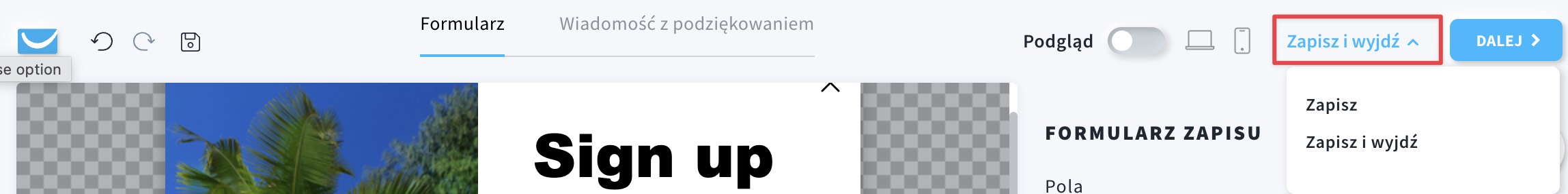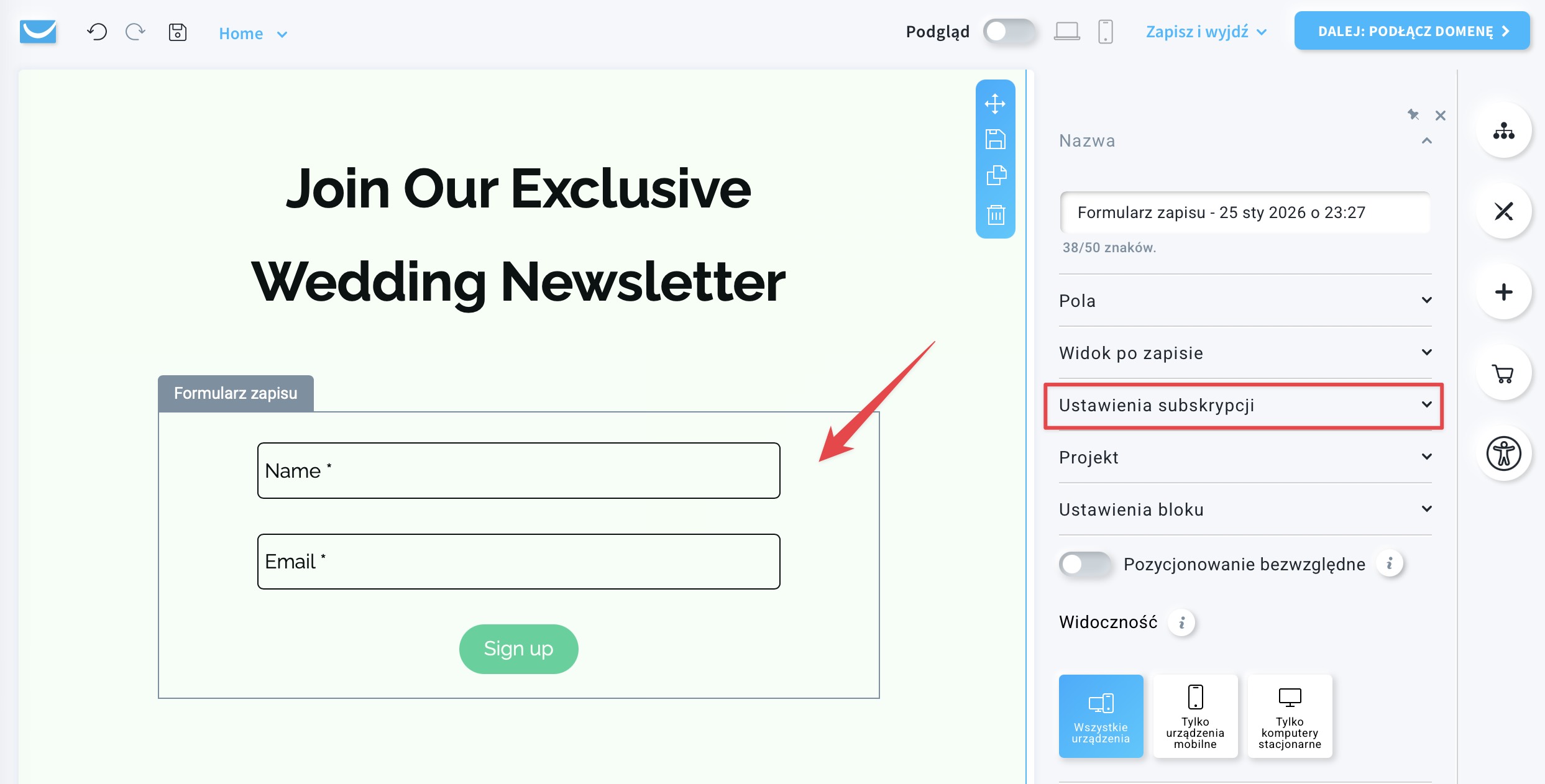 - Kliknij w element Formularz zapisu i rozwiń zakładkę Ustawienia subskrypcji.