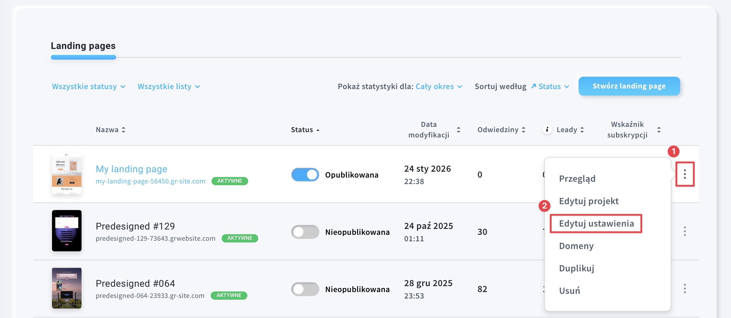 - Wybierz swój landing page, najedź kursorem na menu akcji i wybierz Edytuj ustawienia.