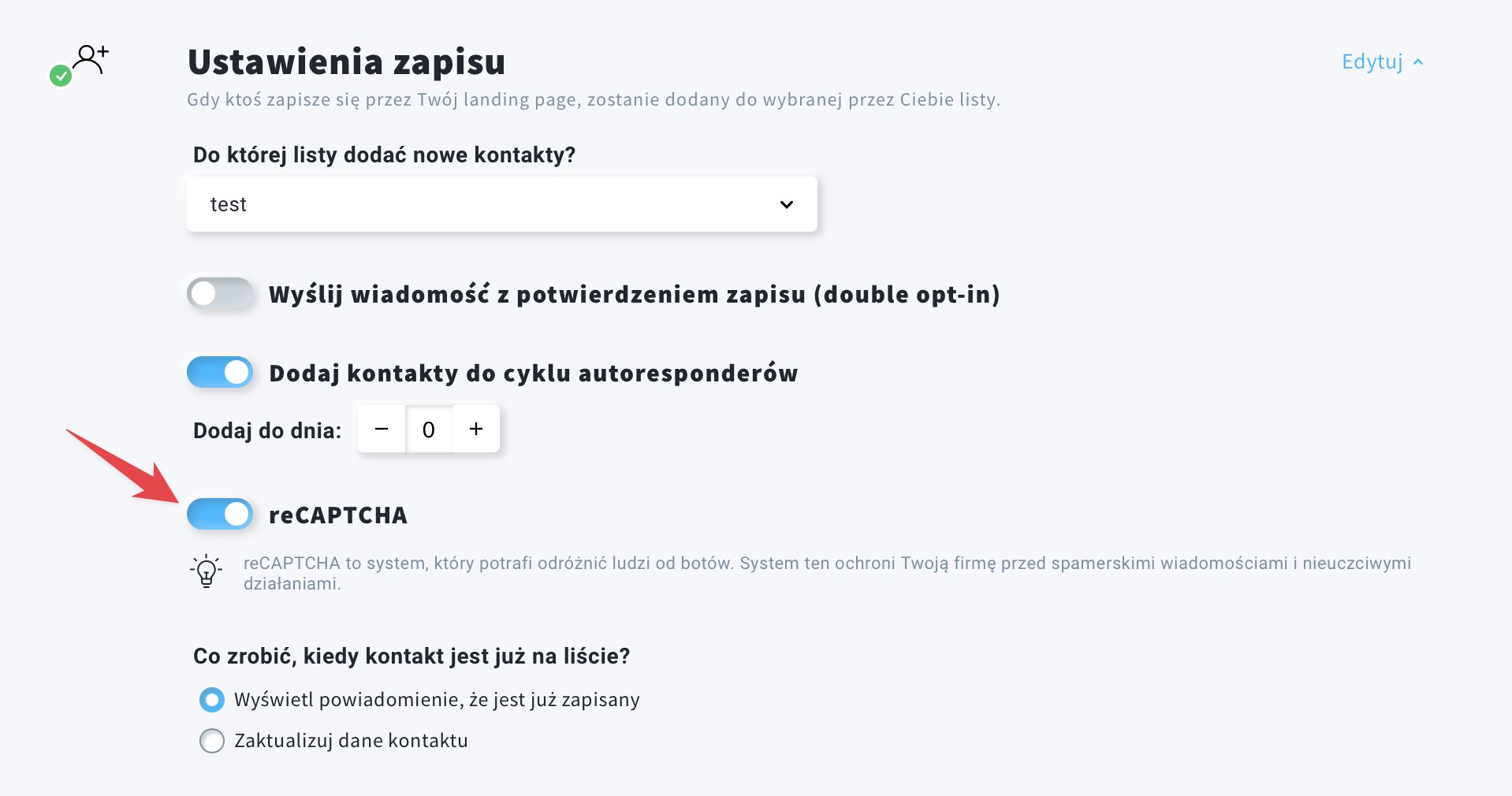 - Włącz reCAPTCHA klikając w przełącznik
