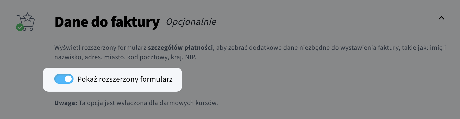 - Możesz również włączyć rozszerzony formularz szczegółów płatności, aby zbierać nazwę firmy, NIP/VAT oraz adres. Dane są przesyłane bezpośrednio do Stripe i dostępne na koncie. Przewiń w dół do sekcji Dane do faktury i przesuń suwak obok opcji Pokaż rozszerzony formularz, aby go włączyć.